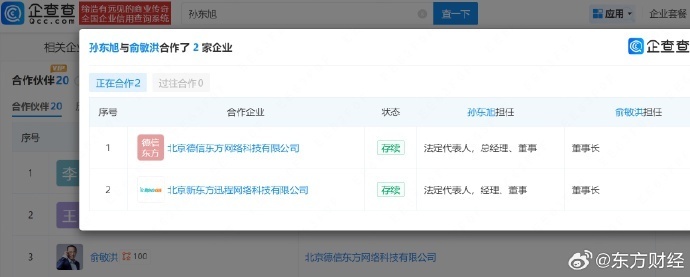 据东方财经,企查查APP显示,目前孙东旭任职多家东方甄选公司高管,与俞敏洪共合作2家企业,包括北京德信东方网络科技有限公司、北京新东方迅程网络科技有限公司,俞敏洪任上述公司董事长,孙东旭任法定代表人、董事等职务。